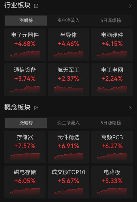 盘面上,电子元器件、半导体、电脑硬件等行业板块涨幅居前;概念板块方面,CPO(光模块)、存储器、元件精选、高频PCB等表现亮眼。