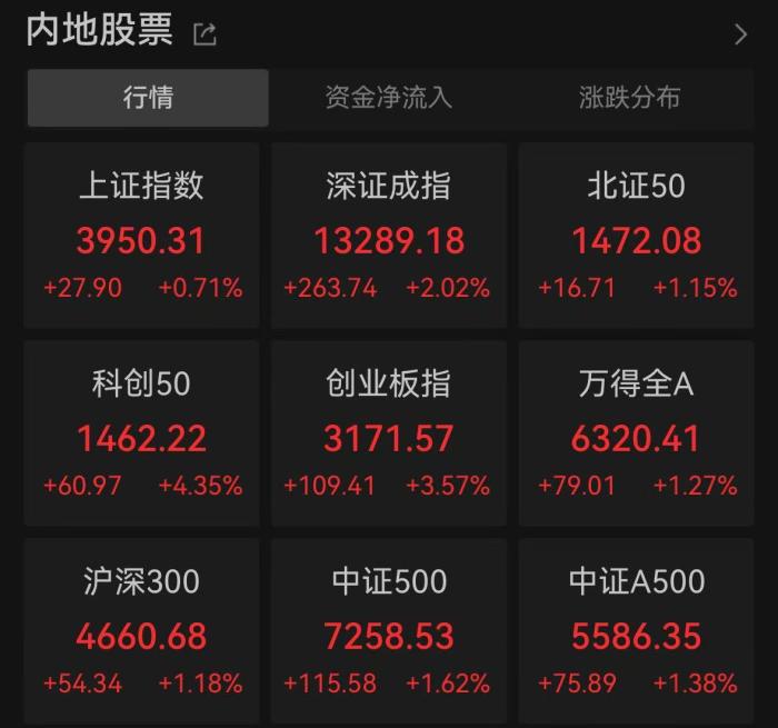 截至收盘,沪指涨0.71%报3950.31点,续创10年新高;深成指涨2.02%报13289.18点;创业板指涨3.57%报3171.57点。沪深京三市全天成交额1.99万亿元,较前一交易日大幅放量。