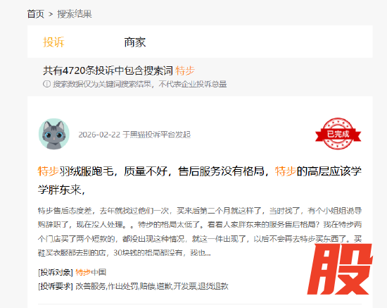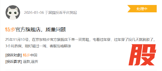 产品质量投诉同样困扰着特步。黑猫平台上,“特步”相关投诉超4000条,集中在鞋子脱胶掉底、衣服洗后变形等问题。