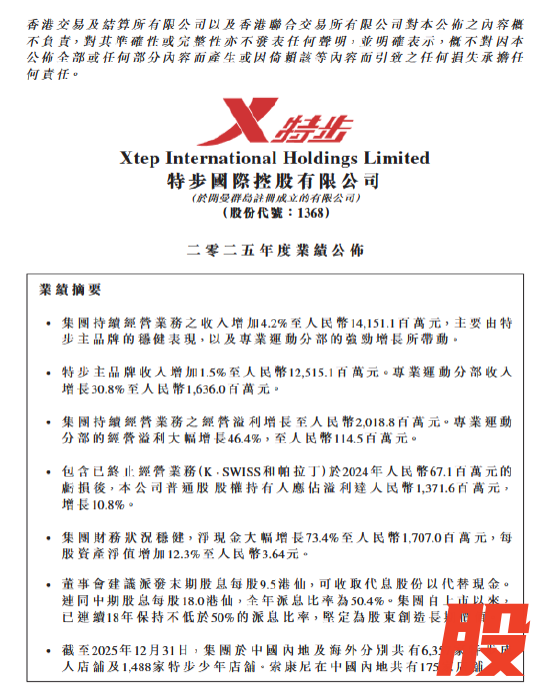 财报显示,截至2025年12月31日,特步国际收入同比增加4.2%至141.51亿元;普通股股权持有人应占溢利同比增长10.8%至13.72亿元。财报中,特步国际将增长归因于“特步主品牌的稳健表现”和“专业运动分部的强劲增长”。