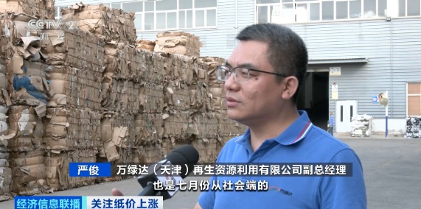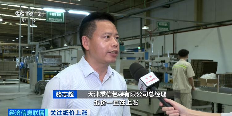 天津秉信包装有限公司总经理骆志超:从七月底开始纸价一直在上涨,基本上一个月会有4次到5次涨价函。一般七月份瓦楞纸价格在每吨2800元,现在来看贝盈网,应该是每吨涨了300元到350元,涨幅在10%到15%左右。