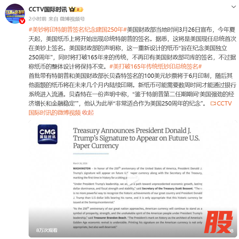 美国财政部当地时间3月26日宣布,今年夏天起,美国纸币上将开始出现总统特朗普的签名。据悉,这将是美国现任总统首次在美钞上签名。美国财政部的声明称,这一重新设计的纸币“旨在纪念美国独立250周年”,同时将打破165年来的传统,不再印有美国财政部司库的签名,不过据称纸币的整体设计将保持不变。